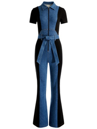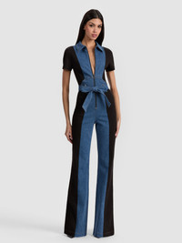 This one lives up to its name. The Gorgeous jumpsuit is cut from soft, stretch color blocked denim with a zip-front bodice, collared neckline, and wide leg that gives major '70s energy. Sleek enough for night, playful enough for daytime-it’s a one-and-done outfit with throwback charm. DETAILS - Wide leg jumpsuit - Colorblocked denim - Collared - Front zipper closure - 94% cotton, 5% elastomultiester, 1% elastane - Dry clean only - Imported FIT - Model is 5'10" and wearing a size 24 - Length from the shoulder: 61 1/2" - Inseam: 34 1/2" - Fits true to size, take your normal size