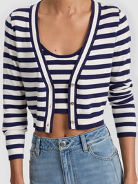 Vintage-inspired and just cropped enough. The Grace cardigan is a cotton knit with vertical stripes, a shrunken silhouette, and a deep V-neckline. Wear it with the matching Maude bralette or buttoned up on its own. It's giving prep, but playful. DETAILS - Striped cardigan - Shrunken fit - V neck - Button front - 100% cotton - Dry clean only - Imported FIT - Model is 5'10" and wearing a size Small - Length from the shoulder: 18 1/2" - Meant for a shrunken fit, size up for a less fitted look
