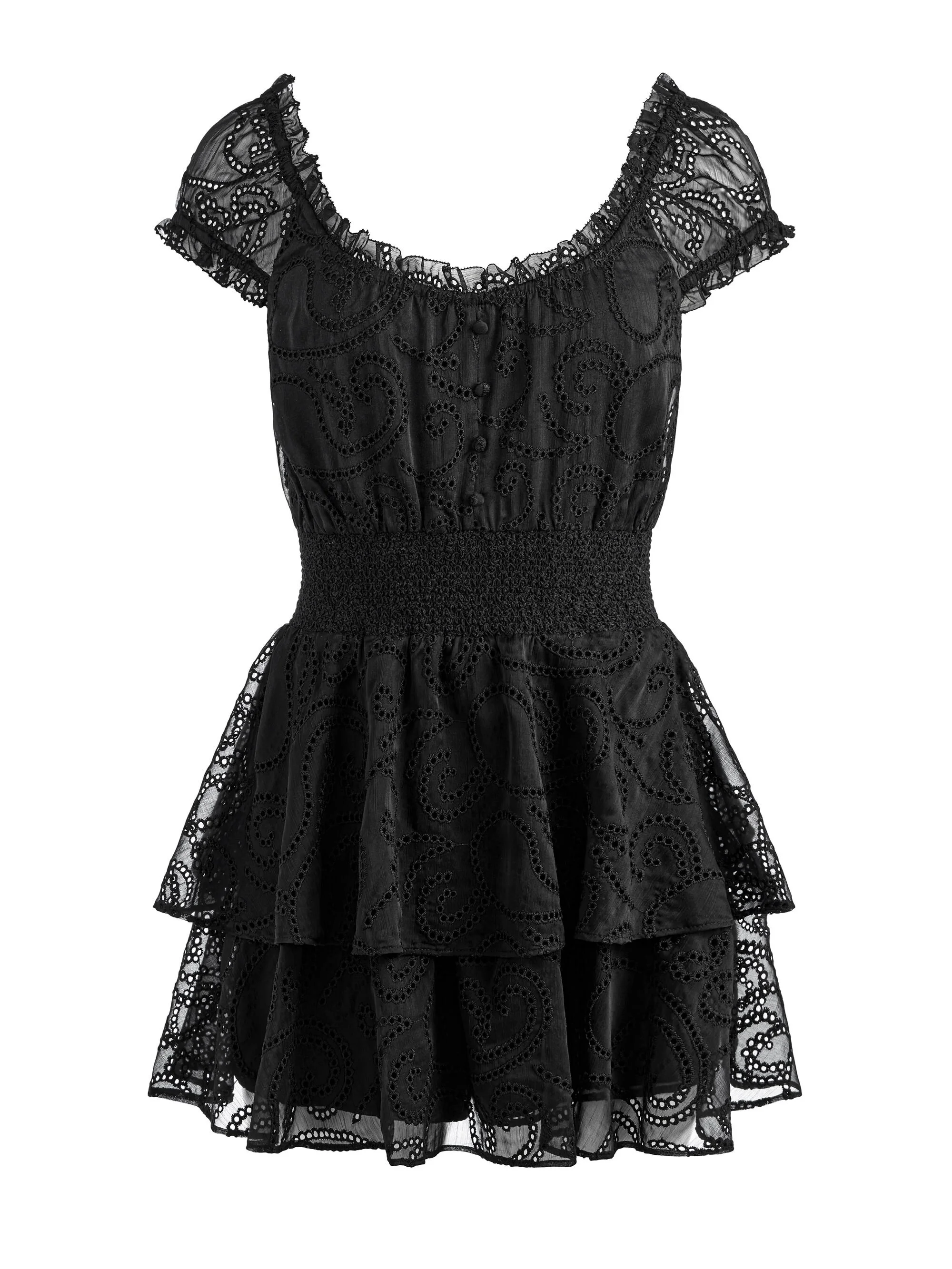 A flirty romper is an easy one-and-done outfit and Gracie is our newest way to make this our daily uniform. We love the flirty shape, the layers of ruffles and the cute scooped neckline. So good with sneakers, sandals or your daily shoe of choice. DETAILS - Eyelet romper - Ruffled - Smocked waist - Cinched cap sleeves - Exposed back zipper closure - 100% polyester - Dry clean only - Imported FIT - Model is wearing a size 2 and her measurements are 5’10”, 32” bust, 23” waist, 34” hips - Total length: 31 1/4” - Fits true to size, take your normal size
