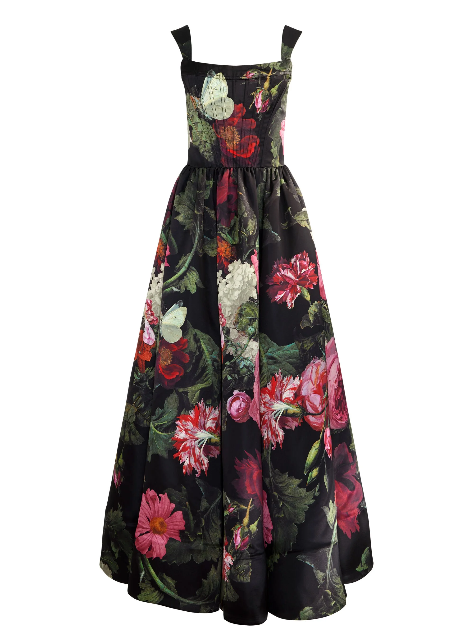 Gothic romance meets feminine tailoring. The Guinevere dress features a structured corset bodice with adjustable straps, a smocked back, and a voluminous A-line skirt in printed duchess satin. Perfect for RSVP dressing, galas, or anywhere you want to feel like the heroine. DETAILS - Ballgown - Printed duchess satin - Fit and flare - Corset bodice - Structured skirt - Smocked back with zipper closure - Adjustable straps - 100% polyester - Dry clean only - Imported FIT - Model is 5'10" and wearing a size 0 - Length from the shoulder: 55" - Fits true to size, take your normal size