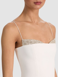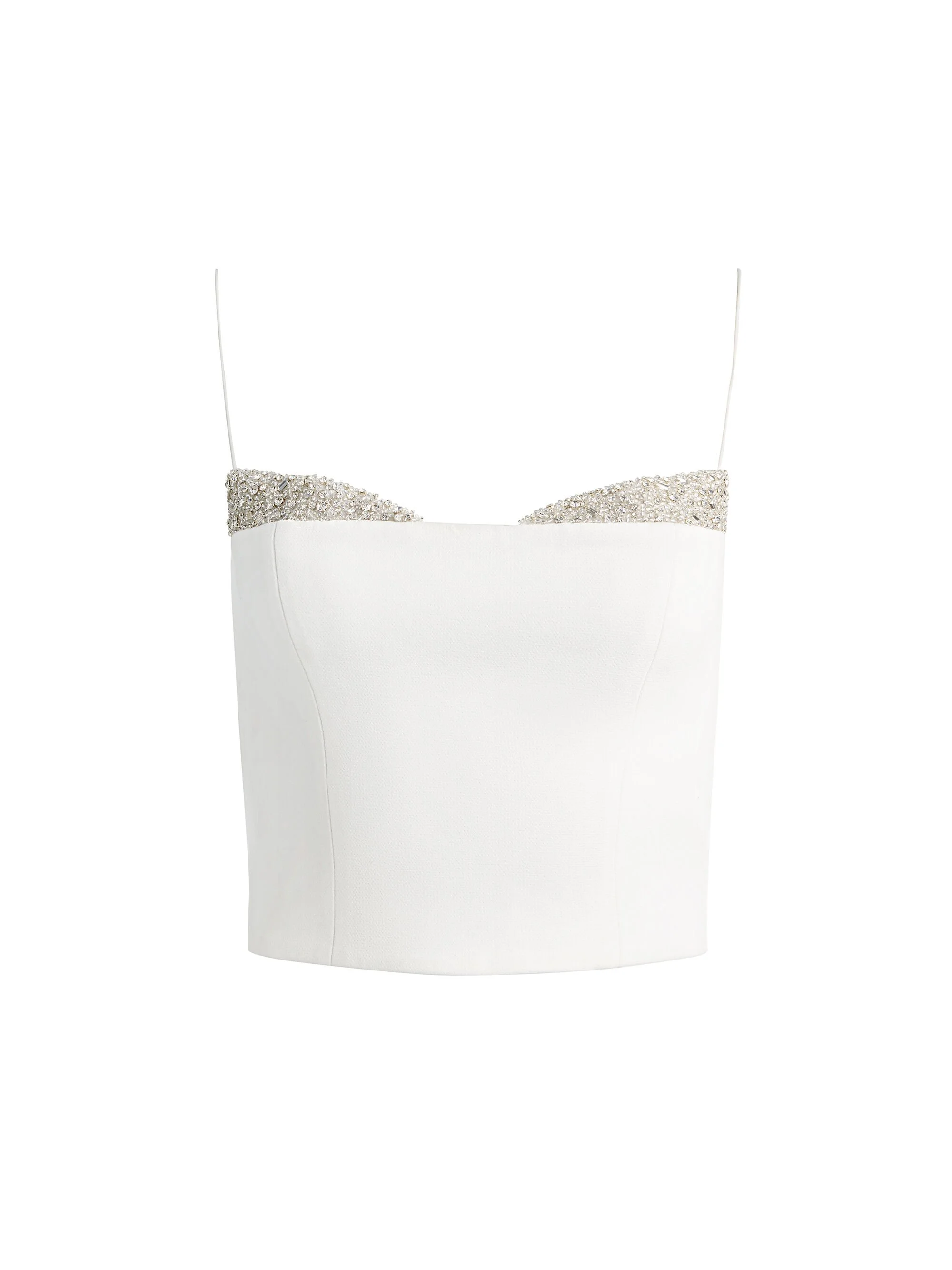 She’s sparkly, but refined. Our Hallie crystal crop top features an embellished peekaboo bustier detail that catches the light in the prettiest way. Slim straps keep it delicate, while the structured fit keeps it sharp. We love pairing it with high rise trousers for cool contrast, or with a full maxi skirt. It works with every one in your closet. DETAILS - Cropped tank - Crystal embellished peekaboo bustier - Spaghetti straps - Back zipper closure - 72% polyester, 23% rayon, 5% elastane - Dry clean only - Imported FIT - Model is 5'10" and wearing a size 0 - Length from the shoulder: 18" - Fits true to size, take your normal size