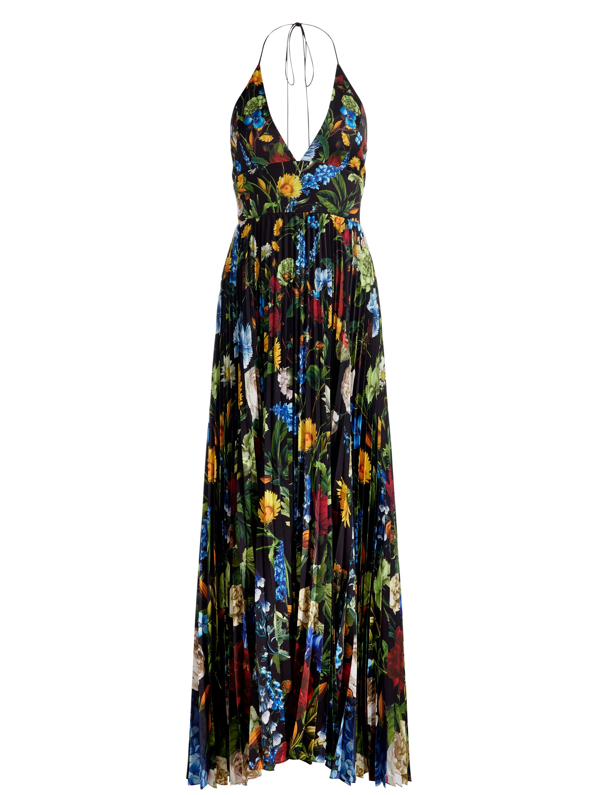 All eyes on you. Our Hannah dress stuns with its deep V neckline, thigh-high slit, and flowing pleated skirt that was made to move. Rendered in lightweight printed satin with a stunning sheen, it’s equal parts sultry and elegant-ideal for weddings, galas or wherever the night takes you. Slip it on and watch heads turn. DETAILS - Maxi dress - Printed lightweight poly satin - Halter neck with tie back closure - High slit - Pleated - Back zipper closure - 100% polyester - Dry clean only - Imported FIT - Model is 5'10" and wearing a size 0 - Length from the shoulder: 60" - Fits true to size, take your normal size