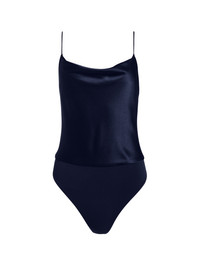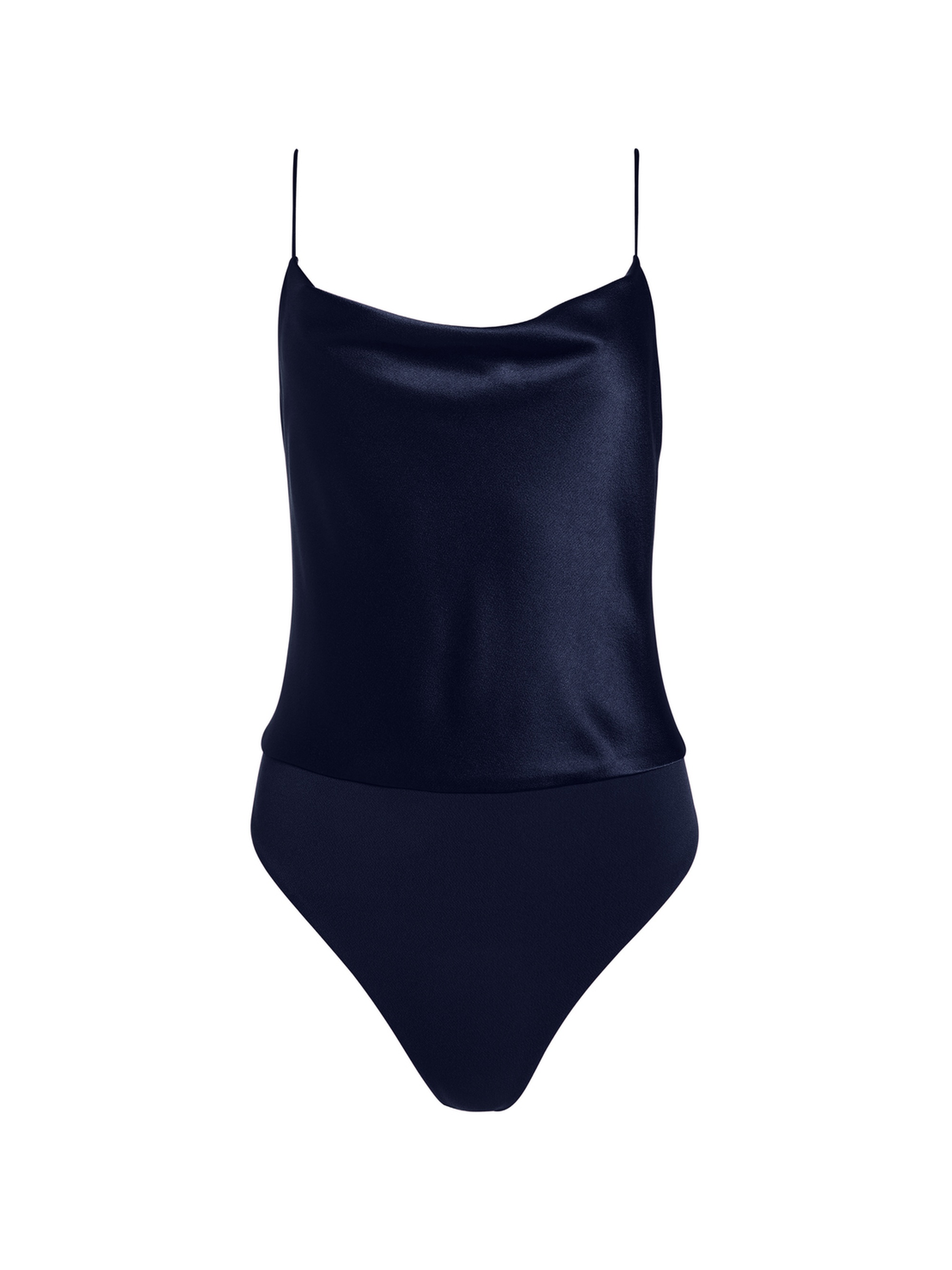 We took our best-selling minimalist camisole and turned it into the perfect bodysuit. Same cute cowl neck and drapey fabric, minus the worry about tucking it in. PRODUCT DETAILS - Spaghetti strap - Slip style - Cowl neck - Thong back - 75% triacetate 25% polyester - Length: 19” from neck to hip seam - Fits true to size, take your normal size - Meghan is wearing a size Small and her measurements are 5’10”, 32” bust, 23” waist, 34” hips - Dry clean only - Imported