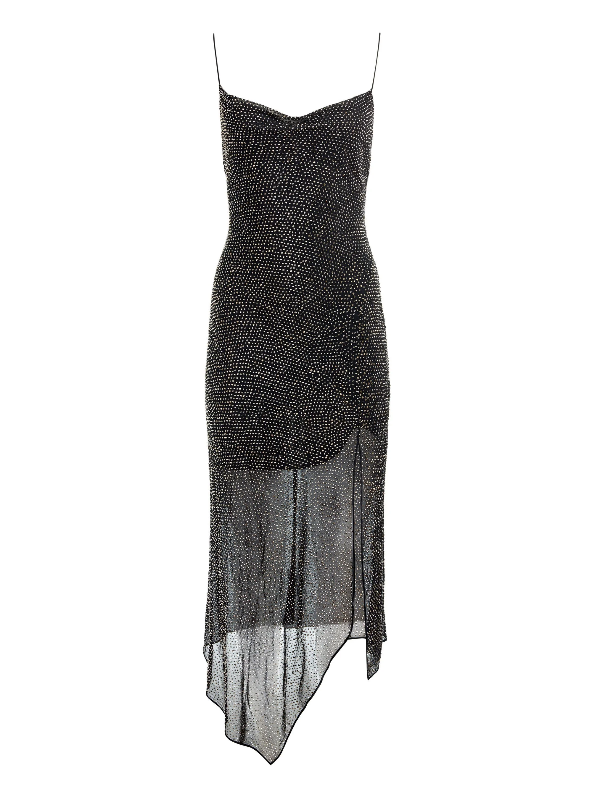Harmony is an ethereal slip dress with a twist- its lightweight georgette is dusted in crystals that shimmer with every step. A draped cowl neckline and asymmetrical hemline add to its flowing elegance, while a thigh-high slit keeps it sultry. Designed to move like liquid, it catches the light beautifully on a dance floor. The perfect marriage of ease and extravagance, it’s made to shine. DETAILS - Midi slip dress - Embellished hematite heat-set crystals on georgette - Front slit - Cowl neck - Asymmetric hem - Attached mini lining - Back zipper closure - 100% polyester - Dry clean only - Imported FIT - Model is 5'10" and wearing a size 0 - Length from the shoulder: 55 1/2" - Fits true to size, take your normal size