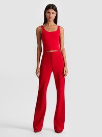 Tailored to turn heads. The Ronnie trouser is a high-rise, slim-fit pant with a subtle bootcut flare that elongates your frame and flatters every curve. Cut in a luxe ruby red twill sateen with just the right amount of sheen, it delivers bold color and crisp structure in one striking package. Finished with slash pockets and precise seaming, it's the ultimate power pant-perfect for styling with blazers, bodysuits, or your favorite knit. DETAILS - Bootcut trouser - Slim fit - High rise - Fit and flare leg - Twill sateen - Hidden front hook and zipper closure - 64% polyester, 32% viscose, 4% elastane - Dry clean only - Imported FIT - Model is 5'10" and wearing a size 0 - Front rise: 10 1/2" - Inseam: 34 1/2" - Fits true to size, take your normal size