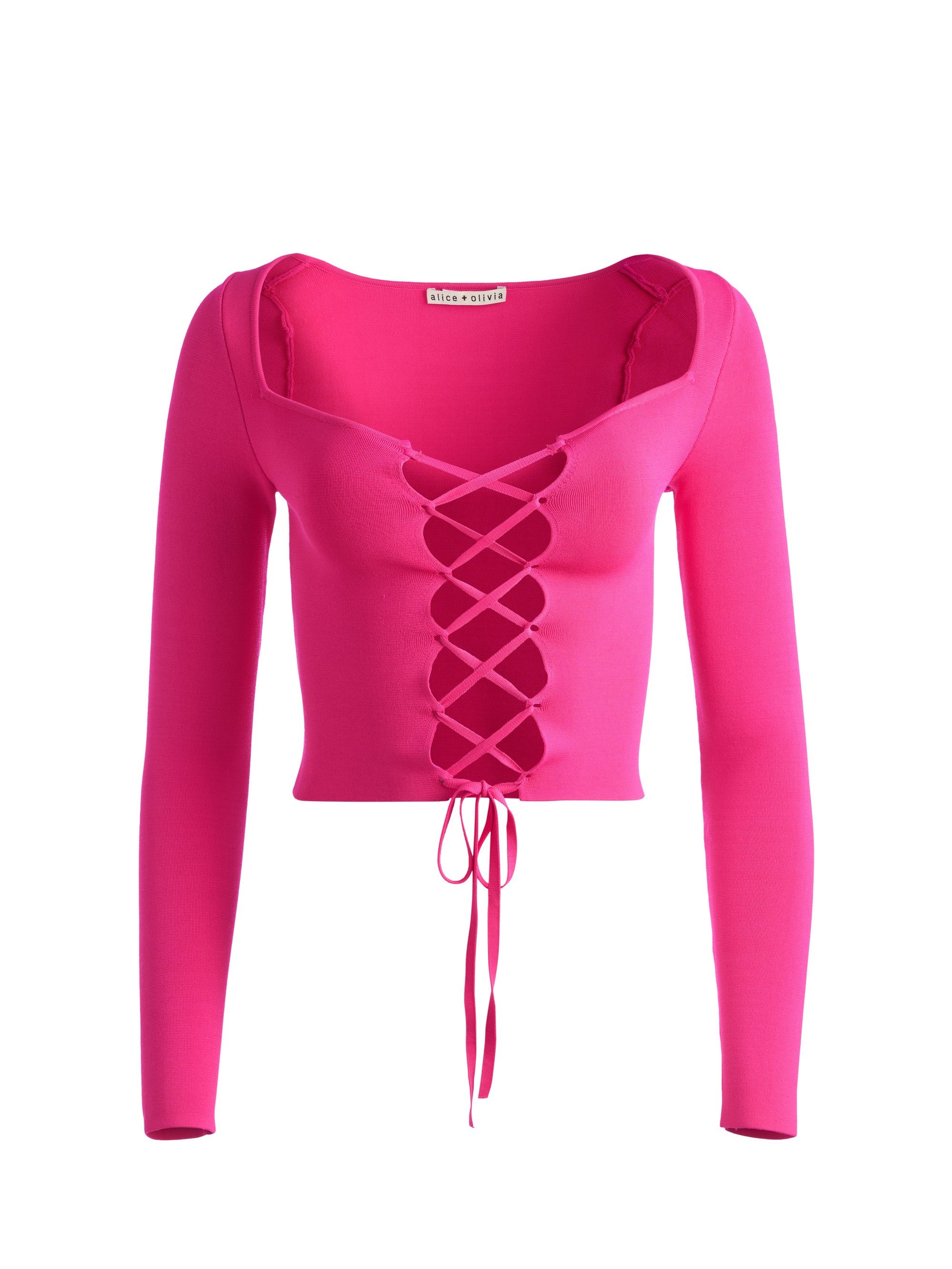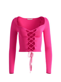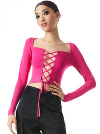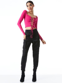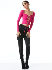 A top made to be seen from all angles, this has a sexy lace-up front that defies that simplicity of the back. It's just right for nights out with your BFFs, when you want to look extra (and honestly, when do you not?). PRODUCT DETAILS - Crop top - Lace front - Bottom tie - Square neck - Long sleeve - Fitted - Total length: 17” - 100% dull rayon - Fits true to size, take your normal size - Aqua is wearing a size Small and her measurements are 5’10”, 32” bust, 23” waist, 34” hips - Dry clean - Imported