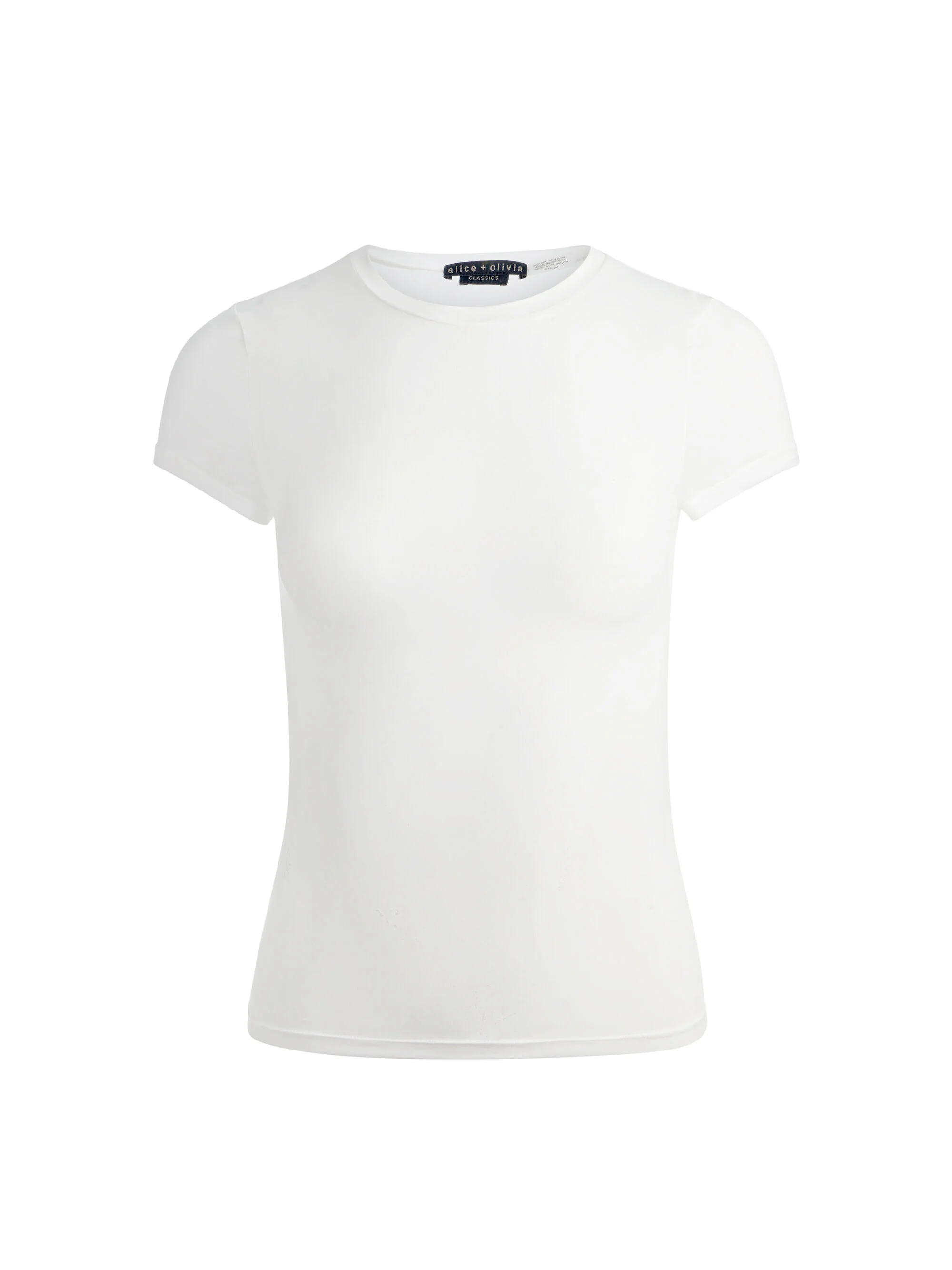 Meet the layering essential that’s anything but basic. The Hottie tee is made from a super-soft, semi-sheer viscose jersey with a sleek, second-skin fit that’s ultra-flattering. Short cap sleeves show off those arms, while the perfect length and shrunken fit keep things cool. Wear it solo with a statement bra or layer it under blazers, dresses, or sheer knits-this one’s heavy in the rotation. DETAILS - Baby tee - Soft viscose jersey - Fitted - Semi sheer - Short sleeves - 85% nylon, 15% elastane - Dry clean only - Imported FIT - Model is 5'10" and wearing a size XS - Length from the shoulder: 23" - Fits true to size, take your normal size