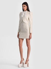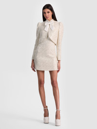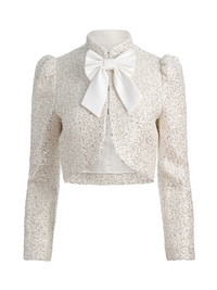 The Ilaria jacket is distinguished by its dreamy embellished tweed, well-defined silhouette and sweet feminine details. It’s impeccably tailored from a cropped length, close-fitting body and sculptural puff shoulders. Rounded hemlines expose a sliver of stomach while a removable girly bow finishes the look. Wear yours with its matching Cade mini dress for a maximalist monochrome look. DETAILS - Cropped jacket - Tweed - Long sleeve - Embellished - Detachable bow - Front hook closure - 100% polyester - Dry clean only - Imported FIT - Model is 5'10" and wearing a size XS - Length from the shoulder: 16" - Fits true to size, take your normal size