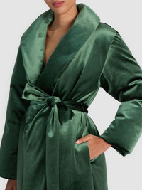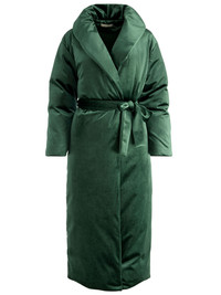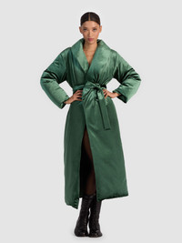Designed in an eye-catching shade of green velvet, this coat turns cold weather into a style moment. It features a shawl collar, adjustable tie waist, and a long, cozy silhouette that's fully lined for comfort. Whoever said layers have to be boring clearly hasn’t met this one - you're not going to want to take it off. DETAILS - Puffer coat - Velvet - Maxi length - Adjustable tie waist - 88% polyester, 12% elastane - Dry clean only - Imported FIT - Model is 5'10" and wearing a size XS - Length from the shoulder: 52" - Fits true to size, take your normal size