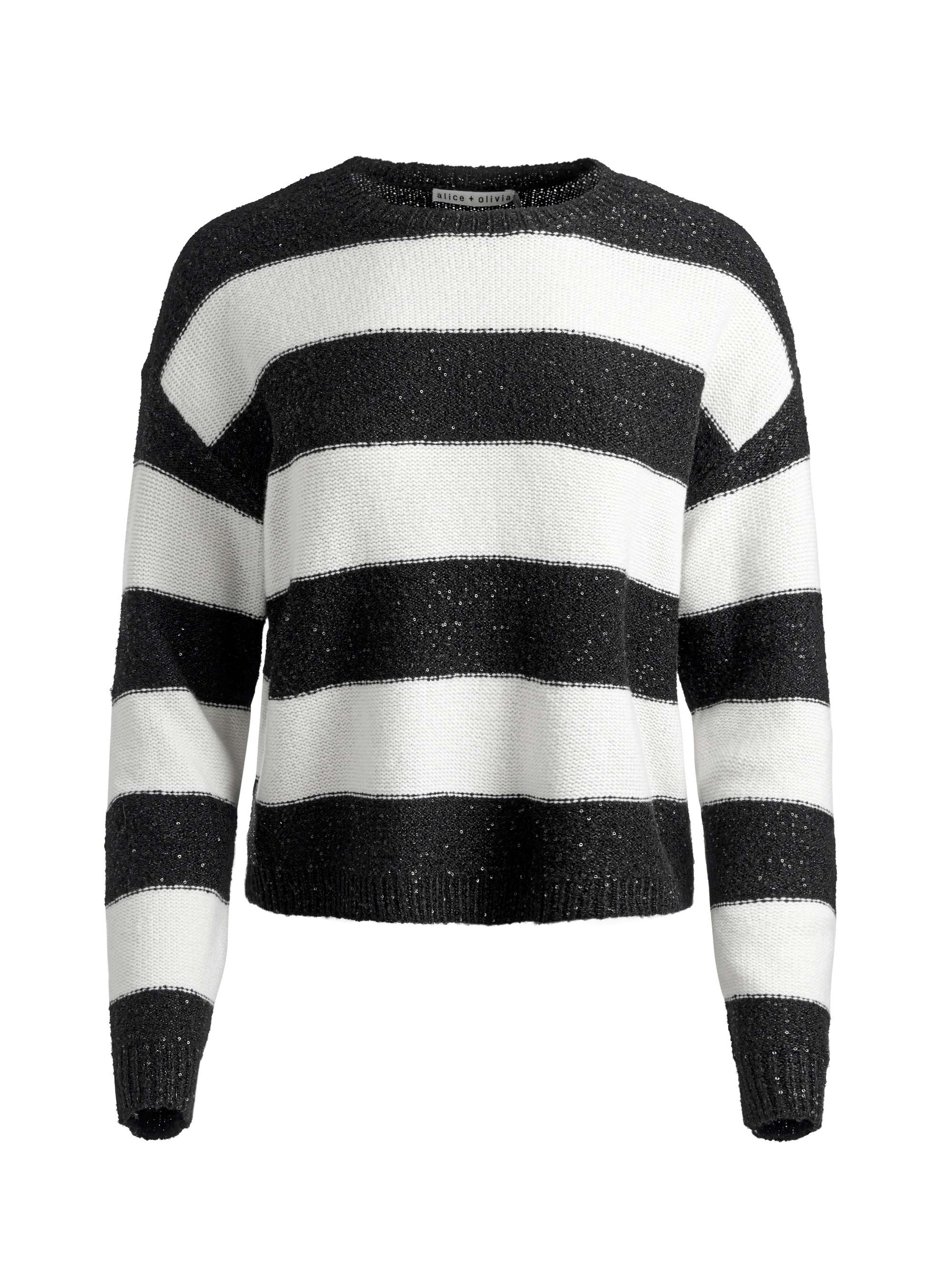 You can never have too many stripes and this black and white pullover is a great addition to your collection. It includes a classic crew neckline, a long sleeve and the softest knit fabric. And would it really be an A+O piece without a little bit of sparkle? DETAILS - Knit pullover - Long sleeve - Crew neck - Sequined stripes - 55% polyester, 24% wool, 12% nylon, 9% cotton - Dry clean only - Imported FIT - Model is wearing a size Small and her measurements are 5’10”, 32” bust, 23” waist, 34” hips - Length from the shoulder: 21" - Fits true to size, take your normal size