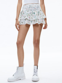 This flirty miniskirt includes eyelet detailing and a ditsy floral print making her extra cute. The smocking at the waist allows for an adjustable fit while the layers of ruffles lend just the right feminine touch. DETAILS - Tiered ruffle skirt - Smocked waist - Eyelet floral - Mid rise - Exposed zipper back closure - 100% cotton - Dry clean only - Imported FIT - Model is wearing a size Small and her measurements are 5’10”, 32” bust, 23” waist, 34” hips - Total length: 14” - Fits true to size, take your normal size