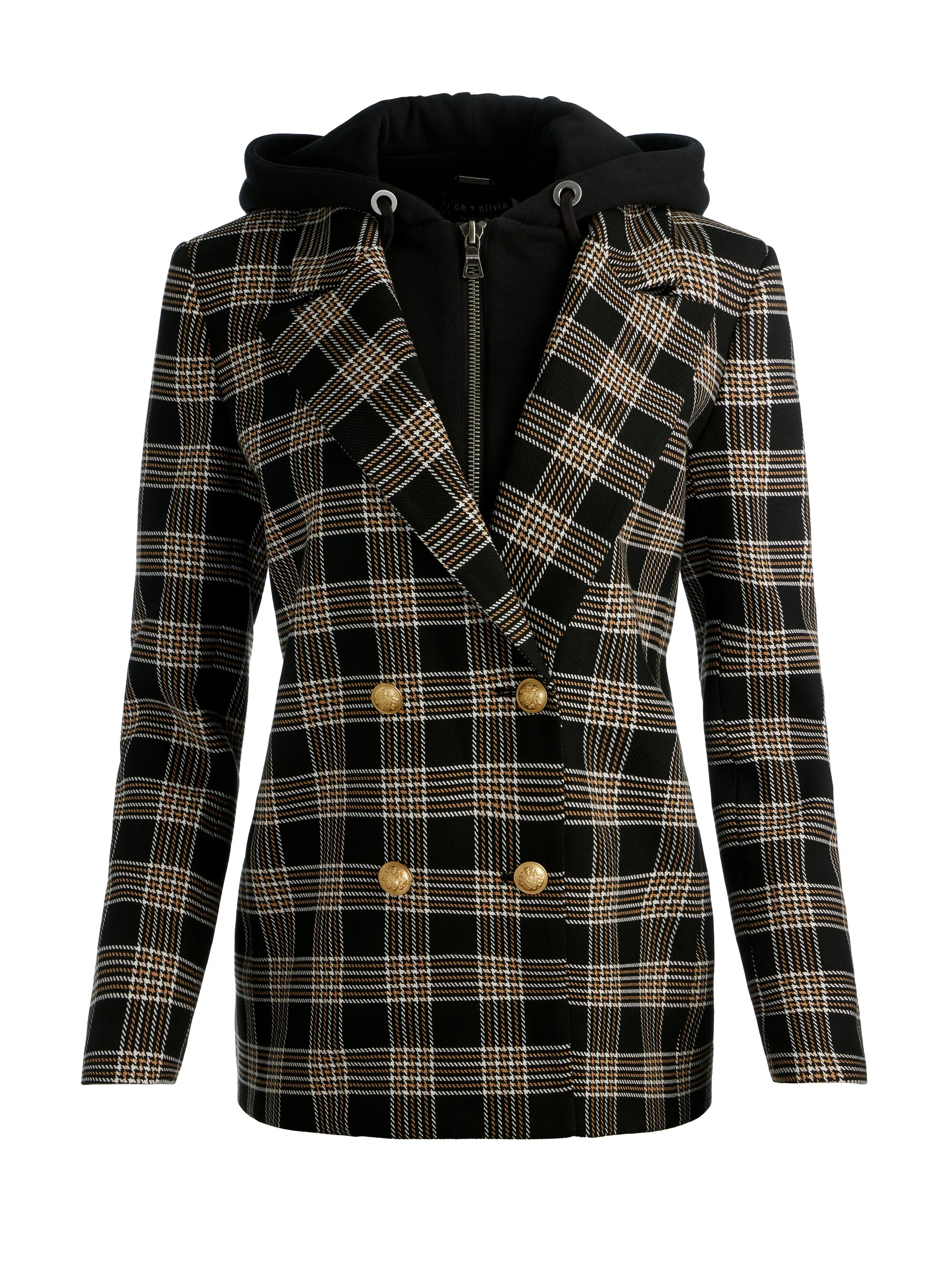 Two looks in one. Jordan’s sharp, double?breasted tailoring means business-until you zip in the heather?grey hoodie insert and suddenly it’s weekend?ready streetwear. Detach the hood for boardroom polish; and snap it back on for coffee runs, concerts, and everything after hours. Consider it your versatile power piece for fall. DETAILS - Hooded blazer - Stretch viscose - Double breasted - Strong shoulders - Removable hoodie - Front button closure - 65% recycled polyester, 32% viscose, 3% elastane - Dry clean only - Imported FIT - Model is 5'10" and wearing a size XS - Length from the shoulder: 28 1/2" - Fits true to size, take your normal size