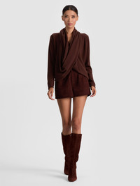 Our cult-favorite Jules Pullover is back by popular demand! Spun from feather-soft, 100% pure cashmere, this gorgeous brown sweater drapes fluidly to flatter every figure. Functional buttons at the neck let you style it in myriad ways-off the shoulder, as a cardigan, draped in front-you can’t go wrong. The curved hem skims the hips for a relaxed yet refined shape, making it effortless to half-tuck into denim or layer over slip skirts. Luxurious, timeless, and versatile-this is a forever favorite. DETAILS - Cashmere pullover - Relaxed fit - Draped front - Curved hem - Back button closures - 100% cashmere - Dry clean only - Imported FIT - Model is 5'10" and wearing a size XS - Length from the shoulder: 28" - Fits true to size, take your normal size