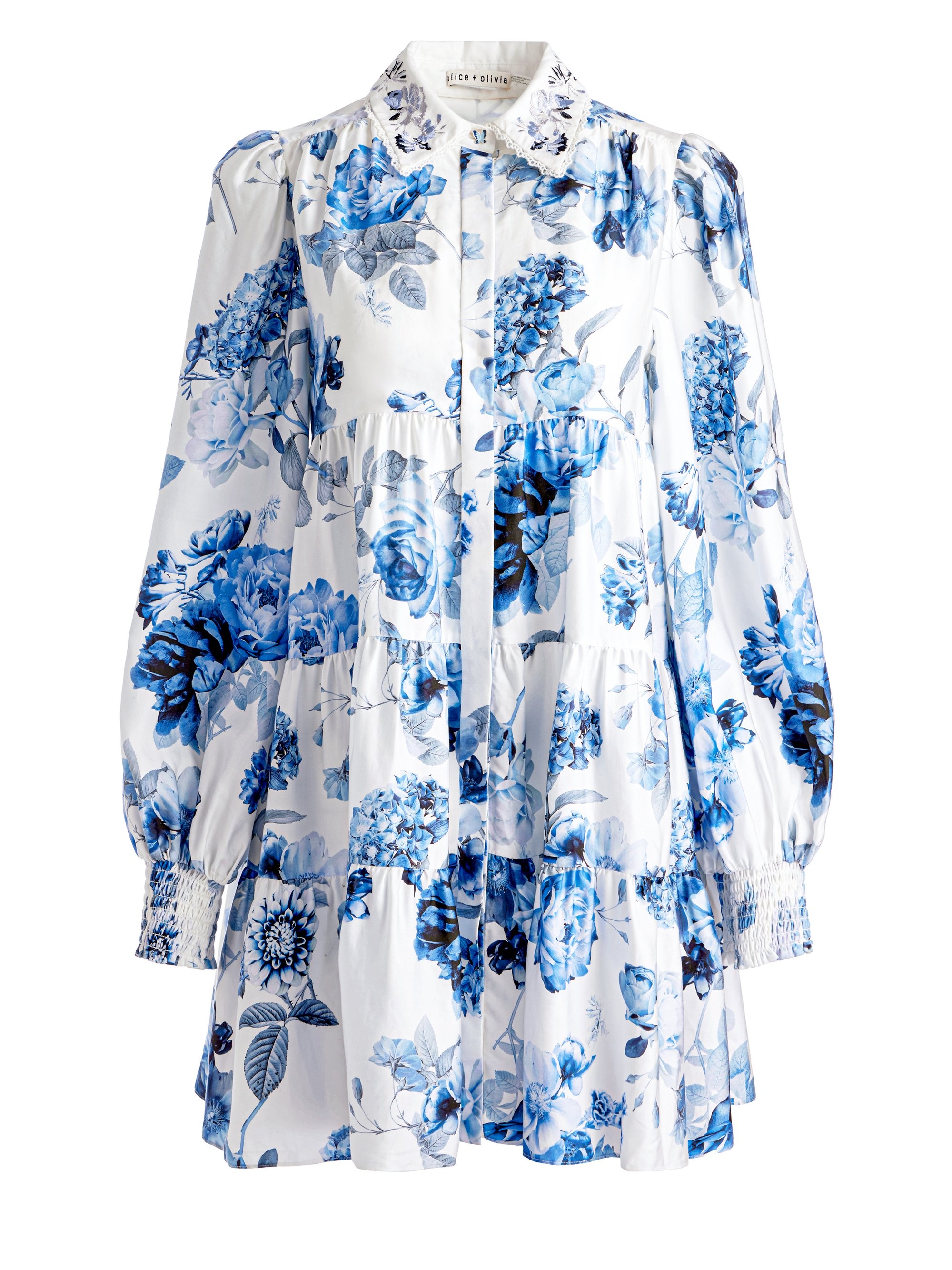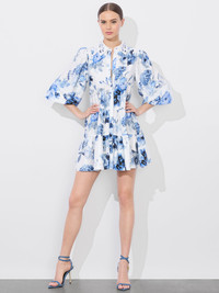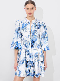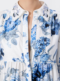 Airy and breezy, our Junia is the throw-on-and-go shirtdress your spring wardrobe needs. Its loose, tiered shape is printed with blue fantasy florals that have an undeniably romantic feel. It has feminine puffed sleeves, a shirt-style design with a neat collar and a button-down front placket. And our favorite design detail? A small butterfly charm button at the collar. Incredibly forgiving and easy to wear, you’ll reach for her again and again. DETAILS - Tiered - Tunic fit - Button front with hidden placket - Collar with embellished butterfly button - Digital all-over floral print on soft tencel satin - 100% lyocell - Dry clean only - Imported FIT - Model is 5'10" and wearing a size 0 - Length from the shoulder: 34" - Fits true to size, take your normal size