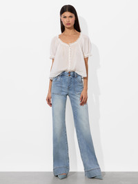 A little retro, a little romantic. Juno’s braided waistband and oversized patch pockets bring a playful twist to your classic wide-leg jean. Designed to sit high and flare just past the ankle, they give ‘70s bell-bottom energy with a modern fit. Tuck in a floaty blouse or pair with a crop-you’ll want these in every wash. DETAILS - Bell jean - Braided waistband - Patch pockets - Double button and zipper closure - Belt loops - 94% cotton, 5% elastomultiester, 1% elastane - Turn inside out and machine wash on cold with like colors - Imported FIT - Model is 5'10" and wearing a size 24 - Front rise: 10 1/2" - Inseam: 34 3/4" - Fits true to size, take your normal size