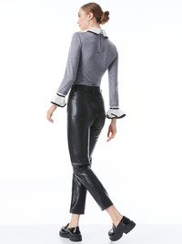 Such a ladylike piece, this does the styling for you. With a pullover silhouette, long ruffled sleeves and bow at the collar it's so elegant and ready to dress the boss you are. PRODUCT DETAILS - Pullover - Long sleeve - Woven - Combo - Ruffle sleeve - Collared - Total length: 15 3/4” - 100% merino wool - BB is wearing a size Small and her measurements are 5’10”, 34” bust, 24” waist, 34” hips - Fits true to size, take your normal size - Dry clean only - Imported