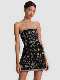 A truly major mini. Our Katia pairs a sequined matte-satin base with ornate beadwork that forms delicate floral motifs--all while keeping the silhouette clean, modern, and sculpted. The strapless neckline, inner grip, and smocked back give it that perfect stay-put fit for big nights out. Add statement earrings and a sleek heel--all eyes will be on you. DETAILS - Mini gown - Sequined matte satin crepe - Embellished beadwork - Strapless with inner non-slip silicone grip - Smocked back with zipper closure - 100% recycled polyester - Dry clean only - Imported FIT - Model is 5'10" and wearing a size 0 - Length from the shoulder: 33" - Fits true to size, take your normal size