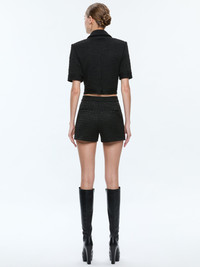 A trouser short is the ideal piece for transitioning into a new season and this one, in a perfect fall tweed, does it effortlessly. It includes a high rise, front pockets and a good amount of stretch for a just-right fit. DETAILS - Tweed shorts - Front button and zipper closure - High rise - Front pockets - 76% polyester, 12% cotton, 10% acrylic, 2% elastane - Dry clean only - Imported FIT - Model is wearing a size 2 and her measurements are 5’10”, 32” bust, 23” waist, 34” hips - Front rise: 11 1/2" - Inseam: 2 3/4" - Fits true to size, take your normal size