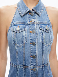 You're looking at an easy denim minidress to keep you cool (and cute). This includes a halter neck, front buttons and collared design that feels sharp. DETAILS - Denim mini dress - Halter neck - Sleeveless - Button front - Seam detailing - Total length: 32 1/2” - 99% cotton, 1% elastane - Model is wearing a size 2 and her measurements are 5'9.5", 31" bust, 23" waist, 34.5" hip - Turn inside out and machine wash on cold - Imported