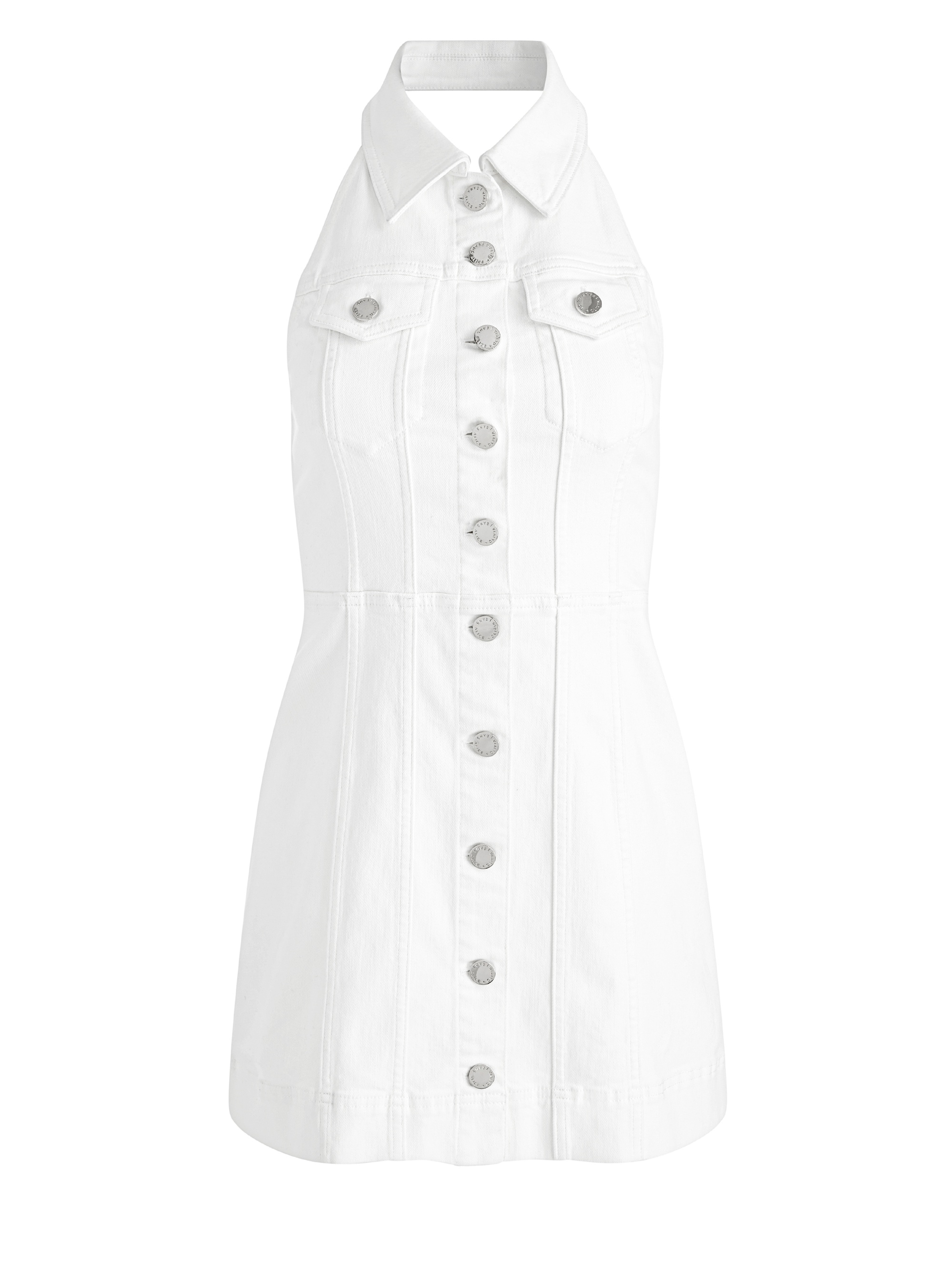 You're looking at an easy denim minidress to keep you cool (and cute). This includes a halter neck, front buttons and collared design that feels sharp. DETAILS - Denim mini dress - Halter neck - Sleeveless - Button front - Seam detailing - 99% cotton, 1% elastane - Turn inside out and machine wash on cold - Imported FIT - Model is wearing a size 2 and her measurements are 5’10”, 32” bust, 22.5” waist, 34.5” hip - Total length: 32 1/2" - Fits true to size, take your normal size