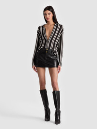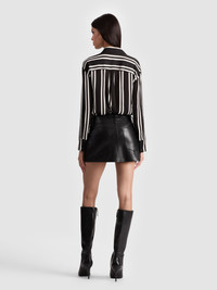 Tiny, shiny, and 2000s in the best way. The Laika skirt is a low-rise mini made from glossy black vegan leather, finished with a double button front and micro-hem that gives serious flashback energy. Style it with an oversized tee or blazer for the ultimate early-aughts remix. DETAILS - Faux leather mini skirt - Low rise - Double button front closure - Fitted - 100% polyurethane - Dry clean only - Imported FIT - Model is 5'10" and wearing a size 2 - Skirt length: 12 1/2" - Runs smaller, if in between sizes, size up one size