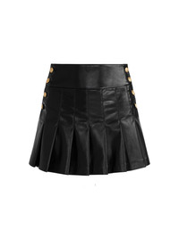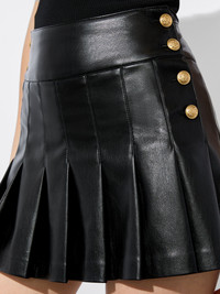 A quintessential piece, The Lanna skirt features a mini length, pleats, and a classic vegan leather fabric made from 100% polyurethane. And of course (of course!) it's embellished with gold buttons. DETAILS - Vegan leather - Side button closures - Pleated - 100% polyurethane - Dry clean only - Imported FIT - Model is 5'10" and wearing a size 0 - Skirt length: 14 5/8" - Fits true to size, take your normal size