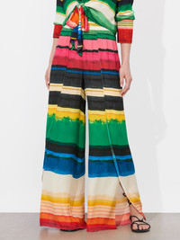 Soft, breezy, and unexpectedly sultry- these flowy pants feature open front pleats that reveal the leg as you walk, creating an almost skirt-like effect. Crafted in our printed double viscose, they sit high on the waist with a smocked band that’s as comfy as it is flattering. Easy to pack, effortless to style-your new vacay essential. DETAILS - Pull on pant - Open pleats - Printed double viscose - Wide leg - High rise - Ankle length - Smocked waistband - 100% viscose - Dry clean only - Imported FIT - Model is 5"10" and wearing a size Small - Front rise: 12 1/2" - Inseam: 30" - Fits true to size, take your normal size