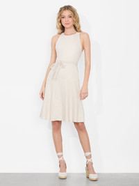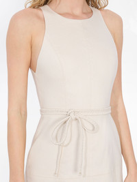 We are obsessed with the clean, minimalist design of our Leandra cream midi dress. It’s crafted from a structured yet breathable linen and cut into an A-line shape with a fitted bodice and slightly flared skirt. A waist-defining braided belt and a smocked back allow for ease of styling. This piece pairs beautifully with neutral-toned sandals for a casual daytime look or sleek heels for a more polished evening outfit. DETAILS - Midi dress - Adjustable braided belt - Linen - A-line fit - Smocked back with zipper closure - 56% linen, 43% viscose, 1% elastane - Dry clean only - Imported FIT - Model is 5'10" and wearing a size 2 - Length from the shoulder: 39 1/2" - Fits true to size, take your normal size
