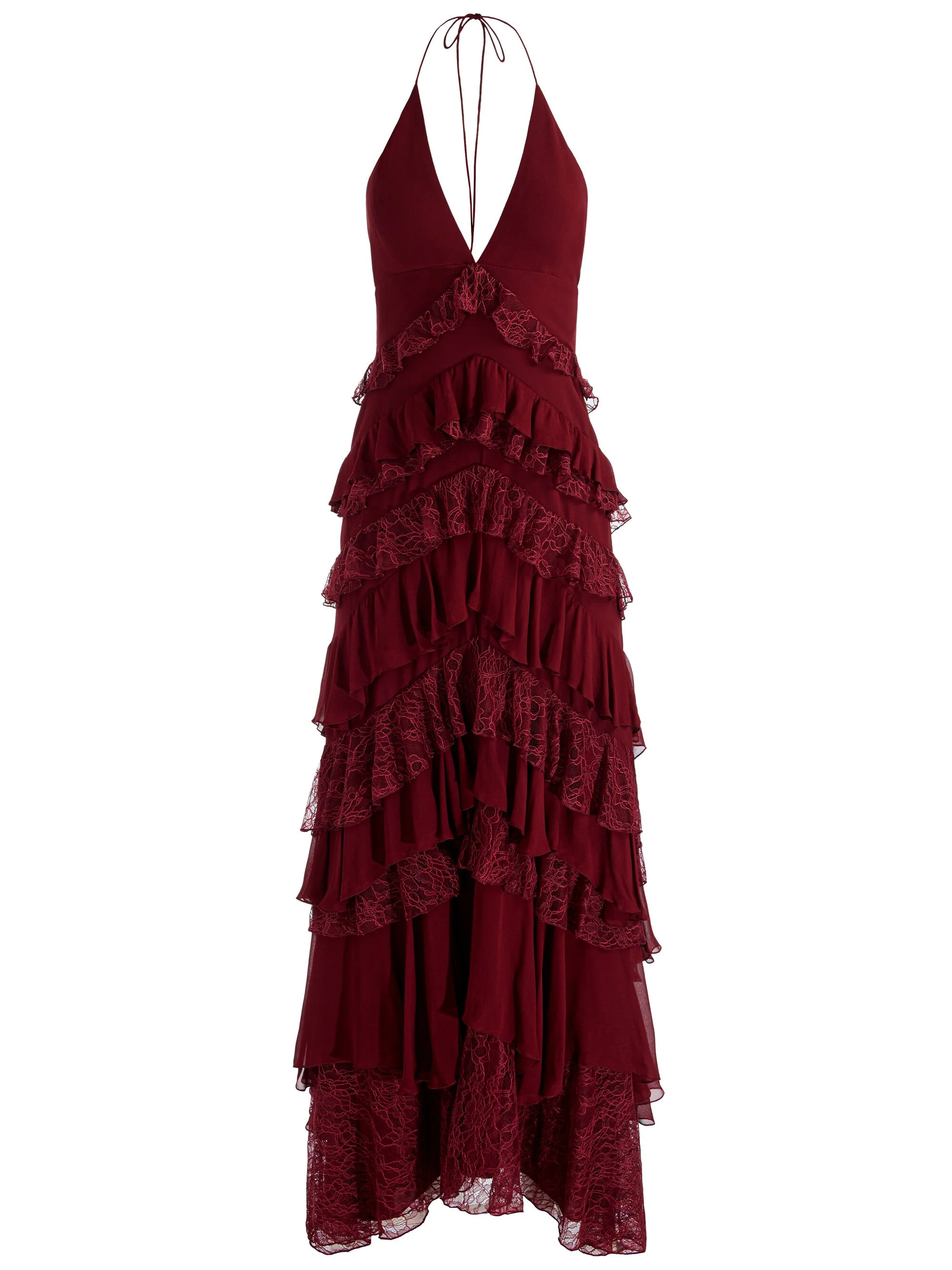 The Liana dress is pure romance, crafted from georgette with cascades of lace ruffles that move beautifully as you walk. A deep V neckline and open back bring allure, while the floor-length hem adds drama. Equal parts sultry and ethereal, it’s the kind of gown that turns every head in the room. Pair with strappy heels to highlight its sweeping silhouette. DETAILS - Maxi dress - Georgette with ruffled lace - Halter neck with open back - Back tie and zipper closure - 100% polyester - Dry clean only - Imported FIT - Model is 5'10" and wearing a size 0 - Length from the shoulder: 59" - Fits true to size, take your normal size