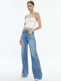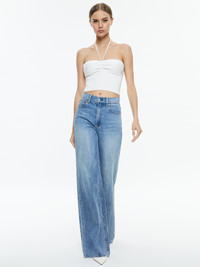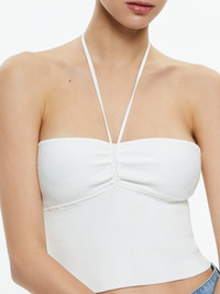 One of our favorite dresses, re-imagined as a shirt. The Linnie ruched halter has the same flattering effect as her one-piece counterpart. We love it paired with miniskirts, shorts and high-waisted denim. DETAILS - Knit crop top - Tie neck halter - Fitted - Ribbed - Sleeveless - 74% cotton, 23% nylon, 3% elastane - Dry clean only - Imported FIT - Model is wearing a size Small and her measurements are 5’10”, 32” bust, 23” waist, 34” hips - Length from the shoulder: 18 1/2" - Fits true to size, take your normal size