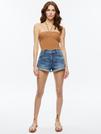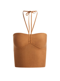 One of our favorite dresses, re-imagined as a shirt. The Linnie ruched halter has the same flattering effect as her one-piece counterpart. We love it paired with miniskirts, shorts and high-waisted denim. DETAILS - Knit crop top - Tie neck halter - Fitted - Ribbed - Sleeveless - 74% cotton, 23% nylon, 3% elastane - Dry clean only - Imported FIT - Model is wearing a size Small and her measurements are 5’10”, 32” bust, 23” waist, 34” hips - Length from the shoulder: 18 1/2" - Fits true to size, take your normal size