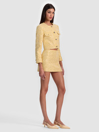 The Lorie jacket brings a dose of modern prep with a touch of sparkle. Cropped and boxy in silhouette, it's covered in pearl and sequin-embellished tweed for a texture that's both polished and playful. The butter-yellow hue feels unexpected for winter, but that's exactly what makes it special--fresh, light, and luxe. Style it with the matching Ellis minidress for a full set moment, or throw it over denim for instant polish. It always works! DETAILS - Cropped jacket - Pearl and sequin embellished tweed - Boxy fit - Button front closures - 100% polyester - Dry clean only - Imported FIT - Model is 5'10" and wearing a size XS - Length from the shoulder: 18 1/4" - Fits true to size, take your normal size
