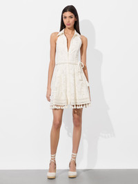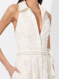 Lucy is a stunning white lace shirt dress that stands out from the rest thanks to that delicate hand embroidery and tasseled hemline. We love the easy and cute fit, not to mention the adjustable tie belt that offers the most flattering waist-hugging silhouette. DETAILS - Mini shirt dress - Embroidered cotton chemical lace - Collared halter neck - Lined - Adjustable tie belt - Button front with hidden placket - Tasseled hem - 90% polyester, 10% cotton - Dry clean only - Imported FIT - Model is 5'10" and wearing a size 0 - Length from the shoulder: 33 1/2" - Fits true to size, take your normal size