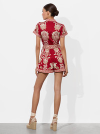 The romper that thinks it's a dress. Lucy blends the structure of a button-down with a flirty, mini silhouette-and yes, there are shorts under there. Finished with a tie waist and rolled sleeves, it’s tailored up top and easy everywhere else. You’ll wear it on repeat. DETAILS - Mini romper - Printed soft poplin - Button front with hidden placket - Rolled sleeves - Mock neck - Adjustable tie waist - 97% cotton, 3% elastane - Dry clean only - Imported FIT - Model is 5'10" and wearing a size 0 - Length from the shoulder: 30 1/2" - Inseam: 2" - Fits true to size, take your normal size