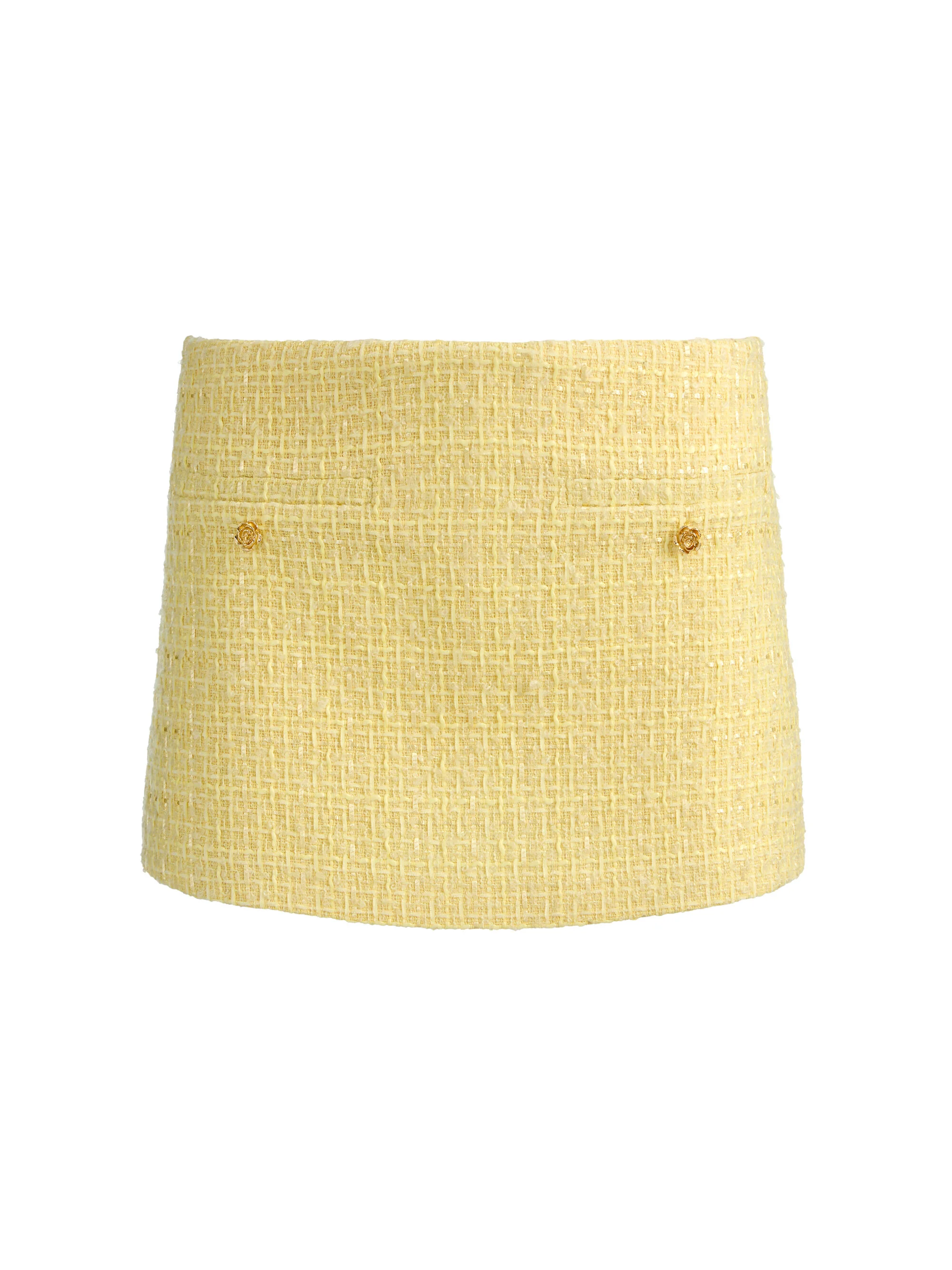 Party in the front, business in the back. The mid-rise Mace yellow mini skort features a smooth, bodycon fit in textured tweed fabric, with a sleek wrap silhouette that resembles a skirt in the front before revealing functional micro shorts in the back. Hidden welt pockets embellished with floral gold buttons polish off this Parisian-inspired silhouette. Match it with the Kidman long jacket and wear the coordinating Shila corset top underneath for a look that’s tres chic. DETAILS - Tweed mini skort - Shorts in back - Front welt pockets with embellished buttons - Back zipper closure - 100% polyester - Dry clean only - Imported FIT - Model is 5'10" and wearing a size 0 - Skirt length: 11" - Fits true to size, take your normal size