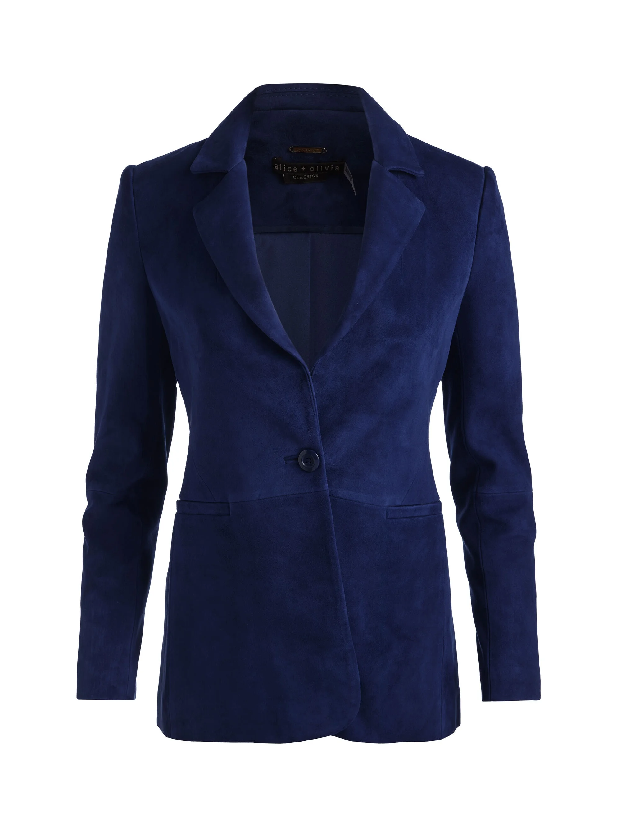 Our Macey navy suede blazer is a gorgeous mix of sophistication and contemporary elegance. Crafted from 100% lamb leather, it has a structured, fitted silhouette with notched lapels and a single-button closure. The strong shoulders add a refined touch, while the luxe suede texture gives it rich depth. The rich indigo hue adds a luxurious, cultivated vibe, making it an exciting addition to any wardrobe. DETAILS - Suede blazer - Fitted - Notch collar - Single button closure - Lined - Strong shoulders - 100% lamb leather - Dry clean only - Imported FIT - Model is 5'10" and wearing a size 2 - Length from the shoulder: 27" - Runs small, size up for a more oversized fit