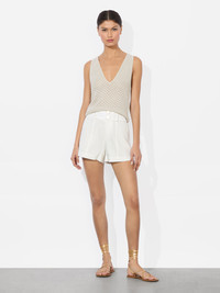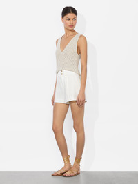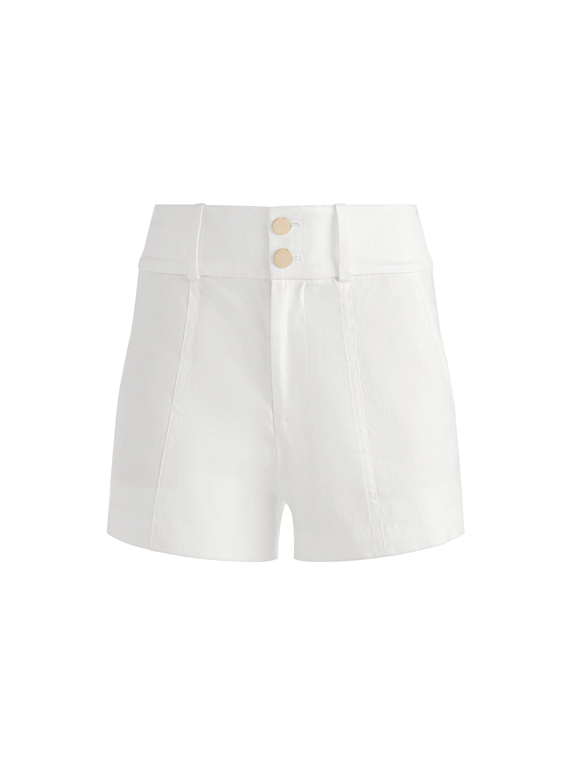 We took one of our best-selling pant silhouettes and crafted her in a new version for the warmer months. Reintroducing the Mame -she has the same flattering fit you know and love, now in a tailored short to show off those legs. Crafted in a lightweight linen blend, she's the perfect pairing piece to add to your rotation all spring and summer. DETAILS - Mini shorts - Linen - High rise - Double button front closure - Wide waistband - 56% linen, 43% viscose, 1% elastane - Dry clean only - Imported FIT - Model is 5'10" and wearing a size 0 - Front rise: 11 1/4" - Inseam: 3" - Fits true to size, take your normal size