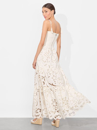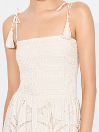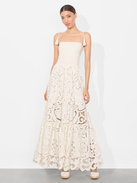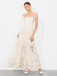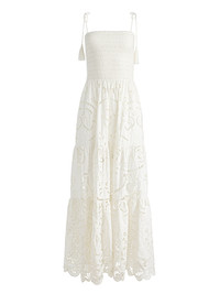 Our Marna white tiered maxi dress feels like the perfect market find plucked during an epic trip, thanks to that intricate eyelet embroidery on a delicate cotton linen blend. She is a stunning piece that will take you from spring to summer, dressed up or down. DETAILS - Maxi dress - Embroidered eyelet cutwork on cotton linen - Tasseled tie straps - Smocked bodice - Tiered skirt - Lined - 60% cotton, 40% linen - Dry clean only - Imported FIT - Model is 5'10" and wearing a size 0 - Length from the shoulder: 59" - Fits true to size, take your normal size