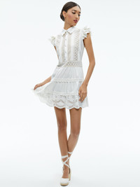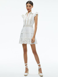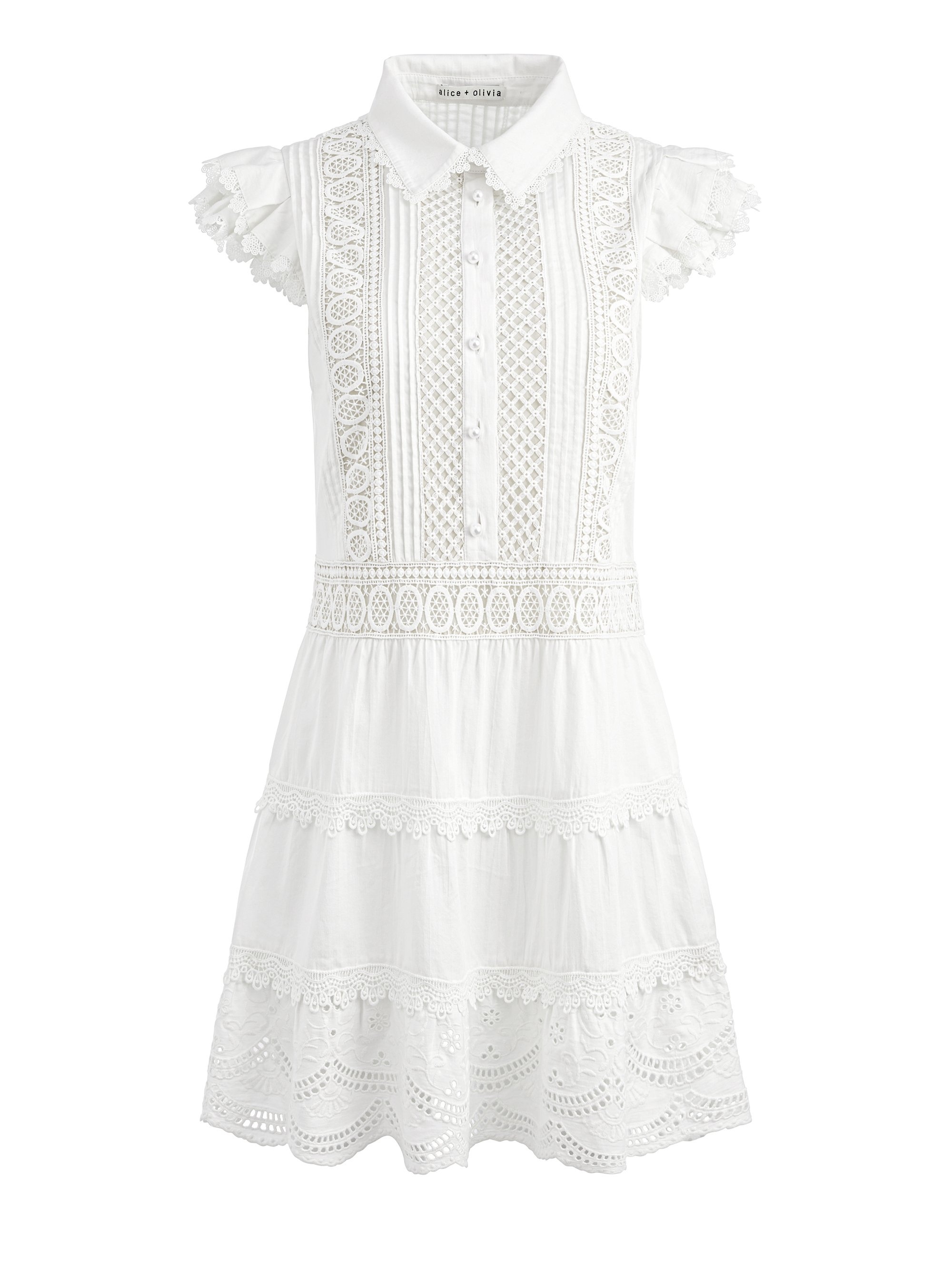 A new way to do the LWD (little white dress), Meeko is a sweet shirt dress that includes dainty ruffled cap sleeves, lace accents and a feminine fit. Pair with sneakers, sandals, you name it. DETAILS - Embroidered shirt dress - Pearl buttons - Ruffled sleeves - Collared - Tiered skirt - 100% cotton - Dry clean only - Imported FIT - Model is wearing a size 2 and her measurements are 5’10”, 32” bust, 23” waist, 34” hips - Total length: 34" - Fits true to size, take your normal size