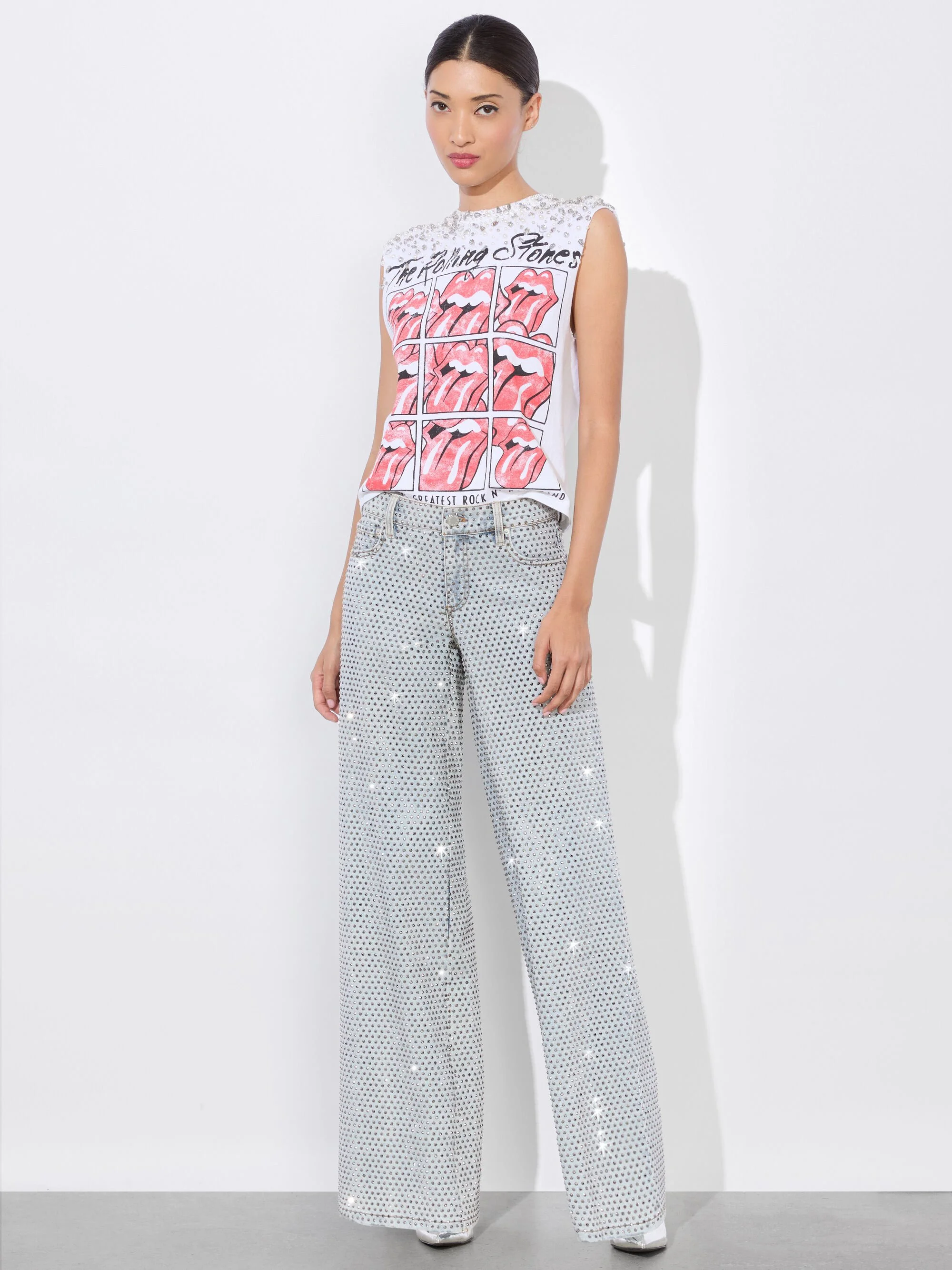 This embellished white muscle tank is anything but your ordinary band tee. Inspired by Stacey's enormous collection of vintage concert T-shirts, Micah is the perfect forever piece to add to your arsenal. DETAILS - Graphic band tee - Embellished - Low rise - Front button and zipper closure - 98% cotton, 2% elastane - Dry clean only - Imported FIT - Model is 5"10" and wearing a size XS/S - Length from the shoulder: 20" - Fits true to size, take your normal size