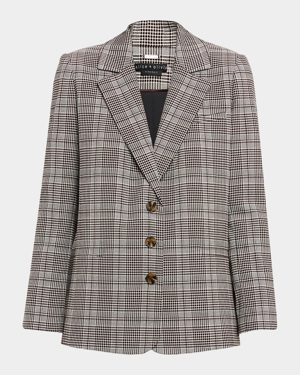 A classic blazer silhouette, the "Michael" jacket by Alice + Olivia features an allover plaid pattern Approx. 28"L from shoulder to hem Notched lapels; singlebreasted front Long sleeves with button cuffs; approx. 32"L Chest welt pocket Hip welt pockets Boxy fit Midlength Polyester/viscose/elastane Lining: Recycled polyester Dry clean Imported