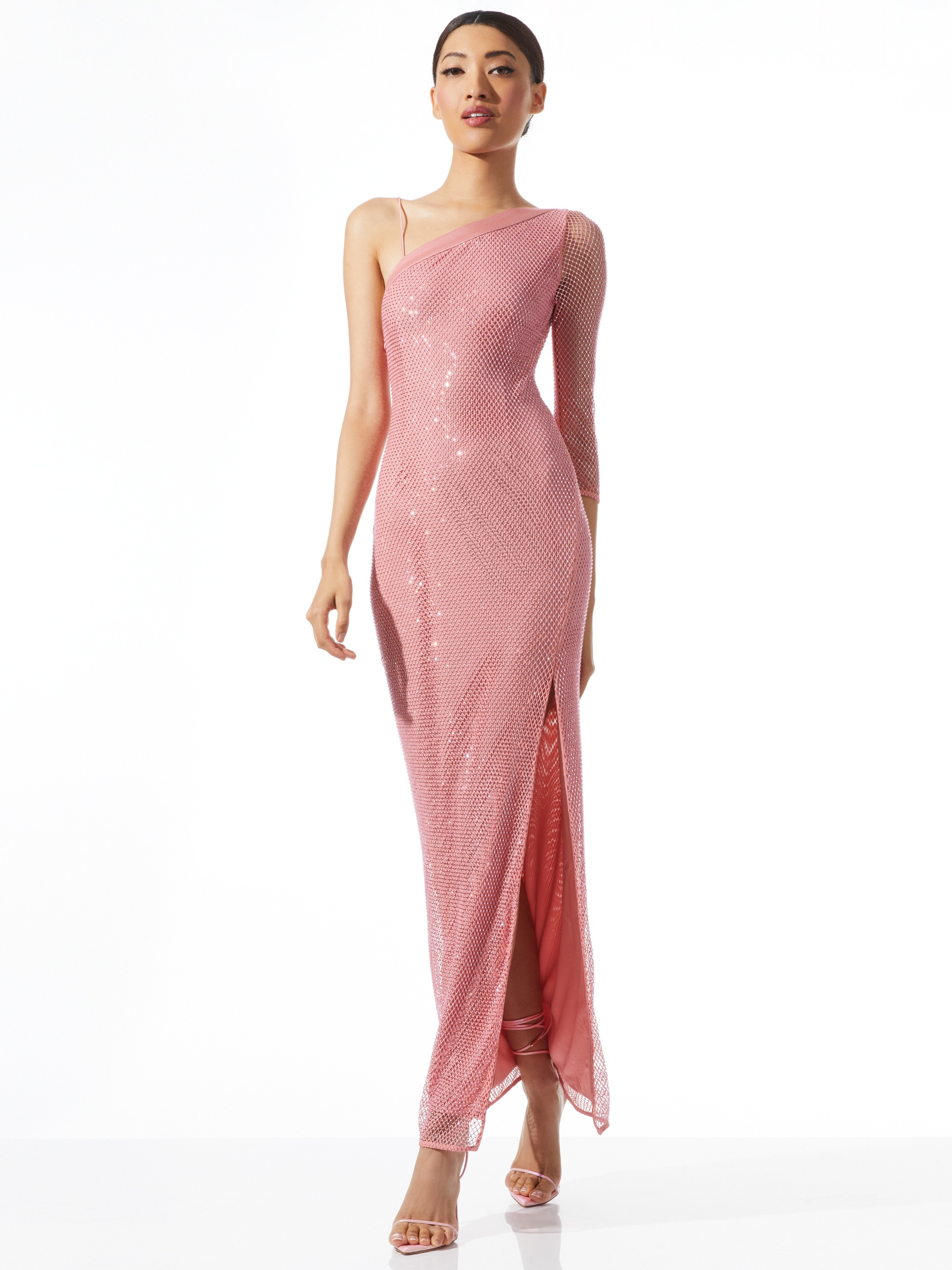 This gorgeous gown includes a high front slit, one shoulder strap and embellishments throughout. Made to enhance your already-existent-stunning-ness. PRODUCT DETAILS - Maxi gown - Embellished - One shoulder - Front high slit - Total length: 60” - 95% polyester, 5% elastane - Aqua is wearing a size 2 and her measurements are 5’10”, 32” bust, 23” waist, 34” hips - Fits true to size, take your normal size - Dry clean only - Imported