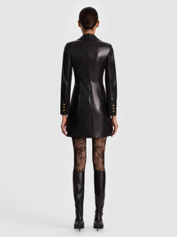 Sharp and sleek with unexpected details, our Michelle is the blazer dress you’ll reach for all fall long. Cut from a glossy vegan leather, it’s designed with strong shoulders, gold front buttons, and buttoned cuffs. Knit panels at the sides add stretch and comfort, sculpting your shape perfectly. Equal parts tough and tailored, it’s your go-to for post-work happy hour. DETAILS - Mini blazer dress - Vegan leather - Shift fit - Side knit panels - Front button closures - 100% polyurethane - Dry clean only - Imported FIT - Model is 5'10" and wearing a size 0 - Length from the shoulder: 33" - Fits true to size, take your normal size