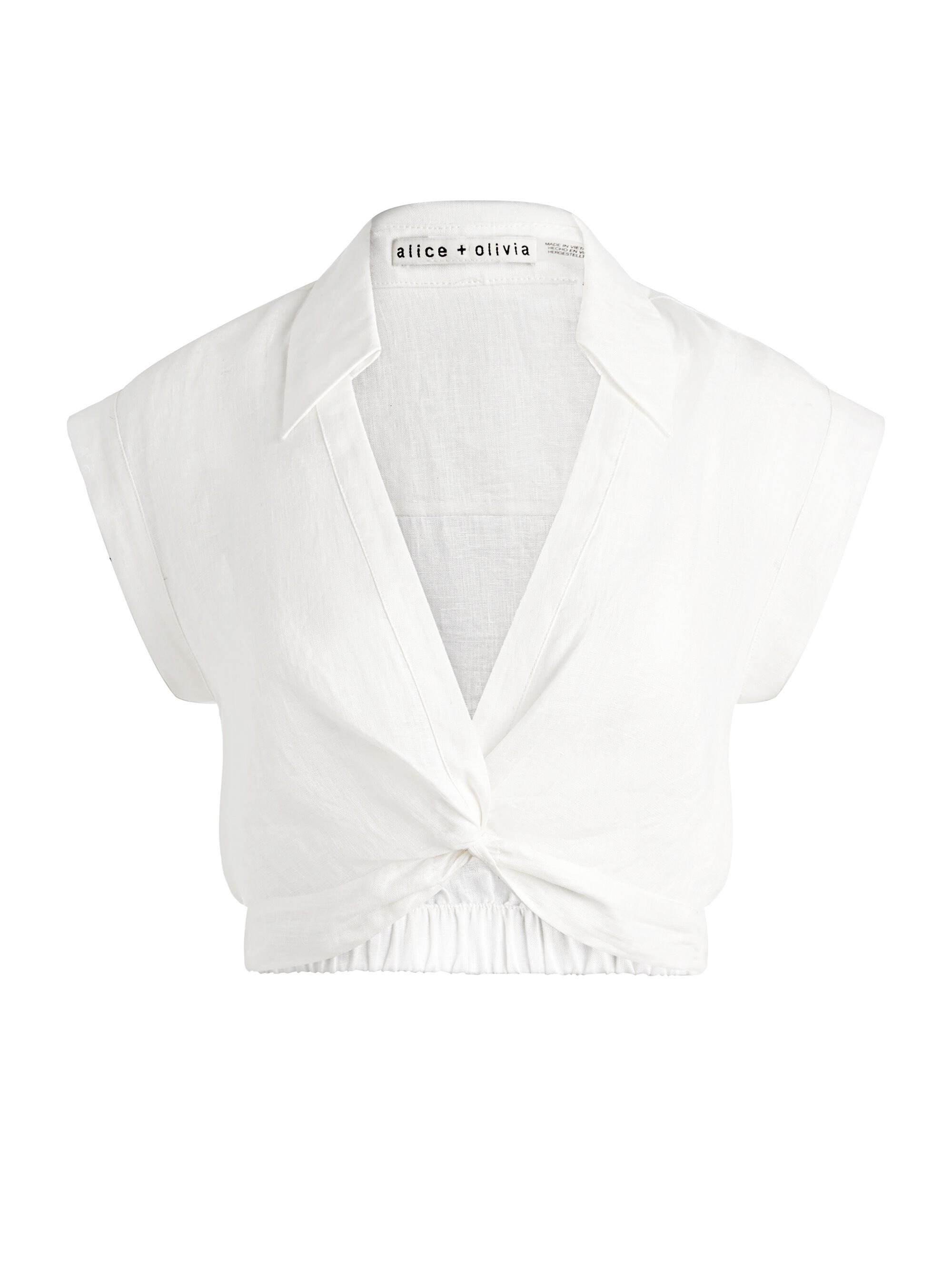 A bestseller reborn. Inspired by our fan-favorite Mila dress, this top version is made from lightweight linen with a deep V-neckline, twist front, and gently cinched back. It’s feminine without being fussy and looks just as good with jeans as it does under a blazer. DETAILS - Crop top - Lightweight linen - V-neck - Twist front - Cinched back - 100% linen - Dry clean only - Imported FIT - Model is 5'10" and wearing a size 0 - Length from the shoulder: 17" - Fits true to size, take your normal size