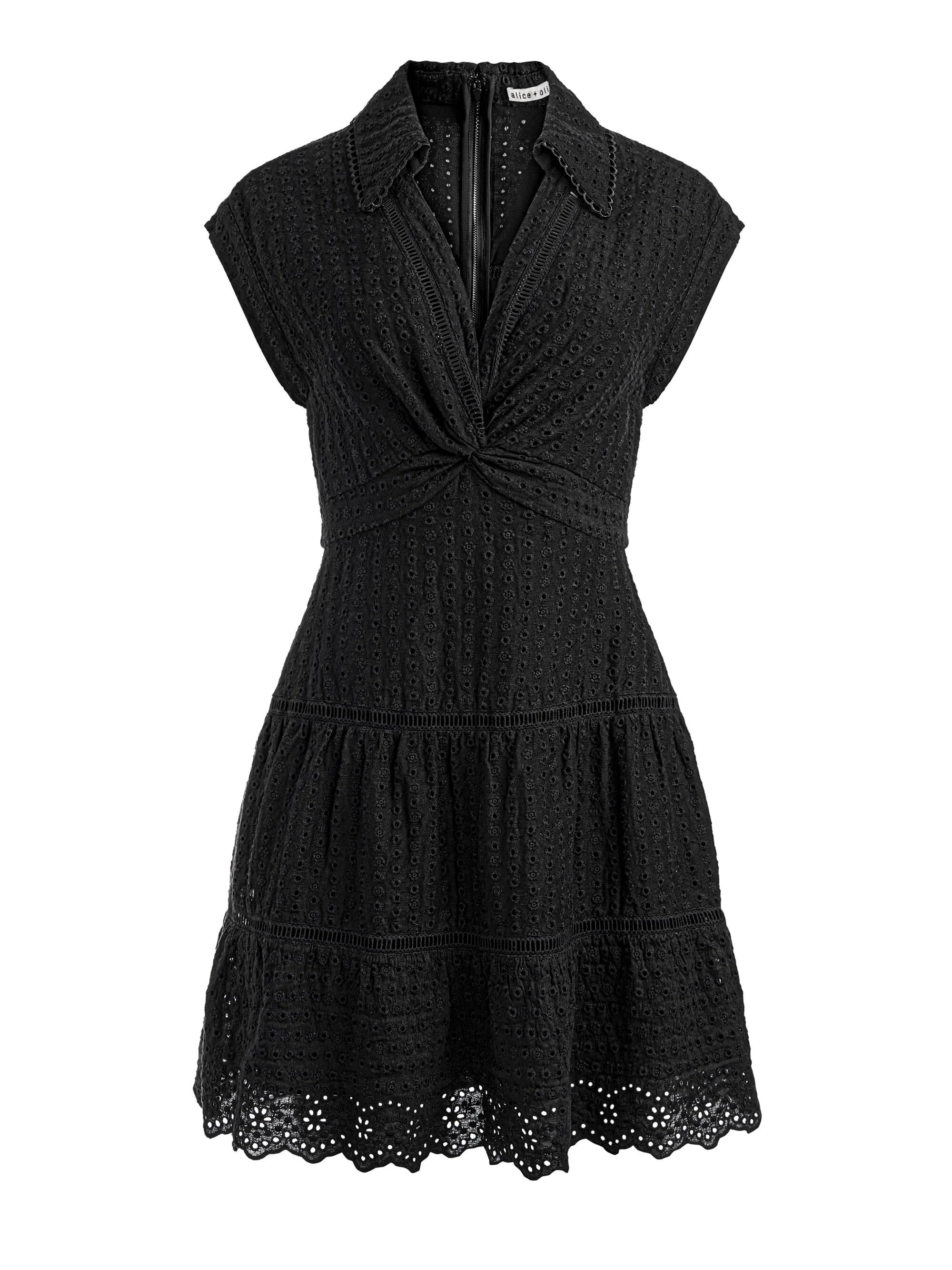 Smart, cool and even a little bit sexy, Mila is the perfect LBD to have in your rotation all spring and summer. This twist front mini dress is crafted from a cotton linen blend with intricate eyelet embroidery, a feminine tiered skirt, and breathable short sleeves. DETAILS - Mini dress - Twist front - Ditsy floral linen eyelet - Collared - Tiered skirt - Back zipper closure - 60% cotton, 40% linen - Dry clean only - Imported FIT - Model is 5'10" and wearing a size 0 - Length from the shoulder: 33 1/2" - Fits true to size, take your normal size