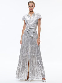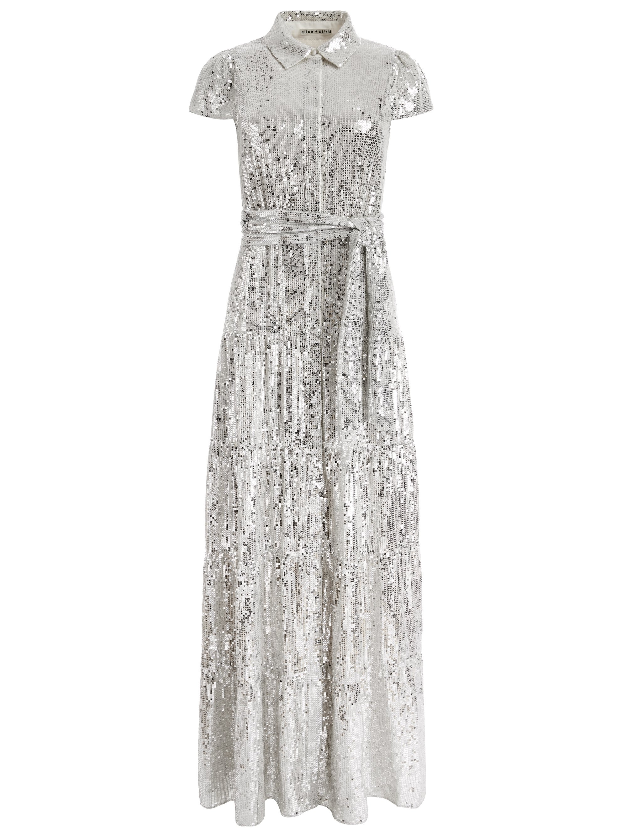 Super feminine-but also exceptionally cool-the Miranda dress is back, but this time it's sequined. We love the tiers at the skirt that give this piece such an artful touch. DETAILS - Sequined maxi dress - Button down with hidden placket - Short sleeves - Collared - Adjustable tie waist - Tiered skirt - 100% polyester - Dry clean only - Imported FIT - Model is wearing a size 2 and her measurements are 5’10”, 32” bust, 22.5” waist, 34.5” hip - Total length: 59 1/2" - Fits true to size, take your normal size