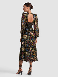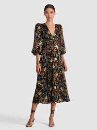 Romance meets edge in this moody floral stunner. The Mona dress is crafted in a silk satin burnout with soft blouson sleeves, a plunging neckline, and a smocked waist that cinches just right. A subtle back cutout adds intrigue, while the midi length keeps things versatile. Wear it with boots during the day and with heels at night-this one does both beautifully. DETAILS - Midi dress - Printed silk satin burnout - A-line fit - Blouson sleeves - Front buttons - Back cutout - Smocked back with zipper closure - 63% viscose, 37% silk - Dry clean only - Imported FIT - Model is 5'10" and wearing a size 0 - Length from the shoulder: 51" - Fits true to size, take your normal size