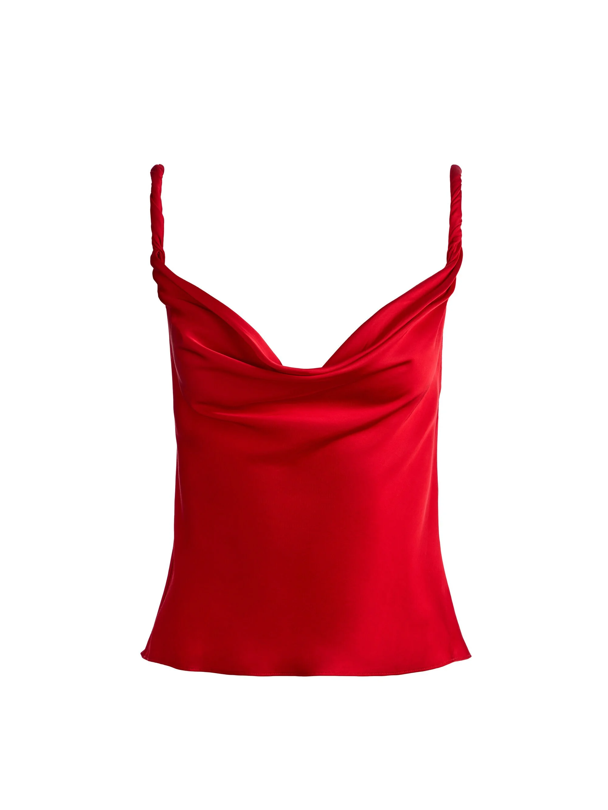 Fluid and striking. Cut from lightweight satin, this tank features a softly draped cowl neckline in both the front and back, framed by twisted straps for subtle detail. The hot red hue brings bold energy, while the silhouette remains clean and modern. Tuck it into tailored trousers or pair with denim for contrast. It’s simple--yet undeniably statement-making. DETAILS - Satin slip tank - Lightweight non-stretch satin - Cowl neck and back - Twisted straps - 65% viscose, 35% modal - Dry clean only - Imported FIT - Model is 5'10" and wearing a size XS - Length from the shoulder: 21" - Fits true to size, take your normal size