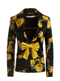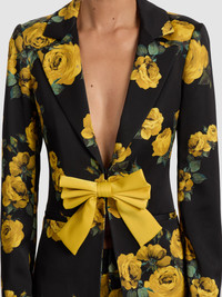One blazer, two moods. This version of the Mya features our rosehips print in recycled satin-back crepe, with a strong shoulder, single hook closure, and optional oversized bow you can wear or remove depending on your vibe. Polished enough for meetings, playful enough for dinner dates. DETAILS - Printed blazer - Recycled satin back crepe - Removable bow - Front hook closures - Strong shoulders - Notch collar - Digitally engineered print - 62% recycled polyester, 36% polyester, 2% elastane - Dry clean only - Imported FIT - Model is 5'10" and wearing a size 0 - Length from the shoulder: 26 1/2" - Fits true to size, take your normal size