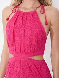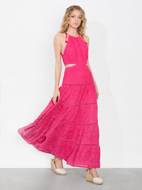 With delicate embroidered tulle and a romantic tiered skirt, this dress is effortlessly ethereal. The cutout waist adds a modern, figure-flattering touch, while adjustable tie tassels bring a hint of bohemian charm. Intricate lace details create beautiful texture and movement, making every step feel graceful. Light, airy, and endlessly elegant, it’s the perfect piece for sunlit days and moonlit nights. DETAILS - Maxi dress - Embroidered tulle - Adjustable tie tassels - Tiered skirt - Cutout waist - Back zipper closure - Lined - Base: 100% nylon - Embroidery: 100% cotton - Dry clean only - Imported FIT - Model is 5'10" and wearing a size 2 - Length from the shoulder: 58" - Fits true to size, take your normal size